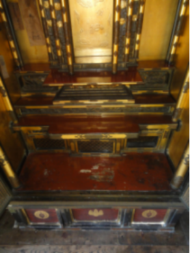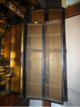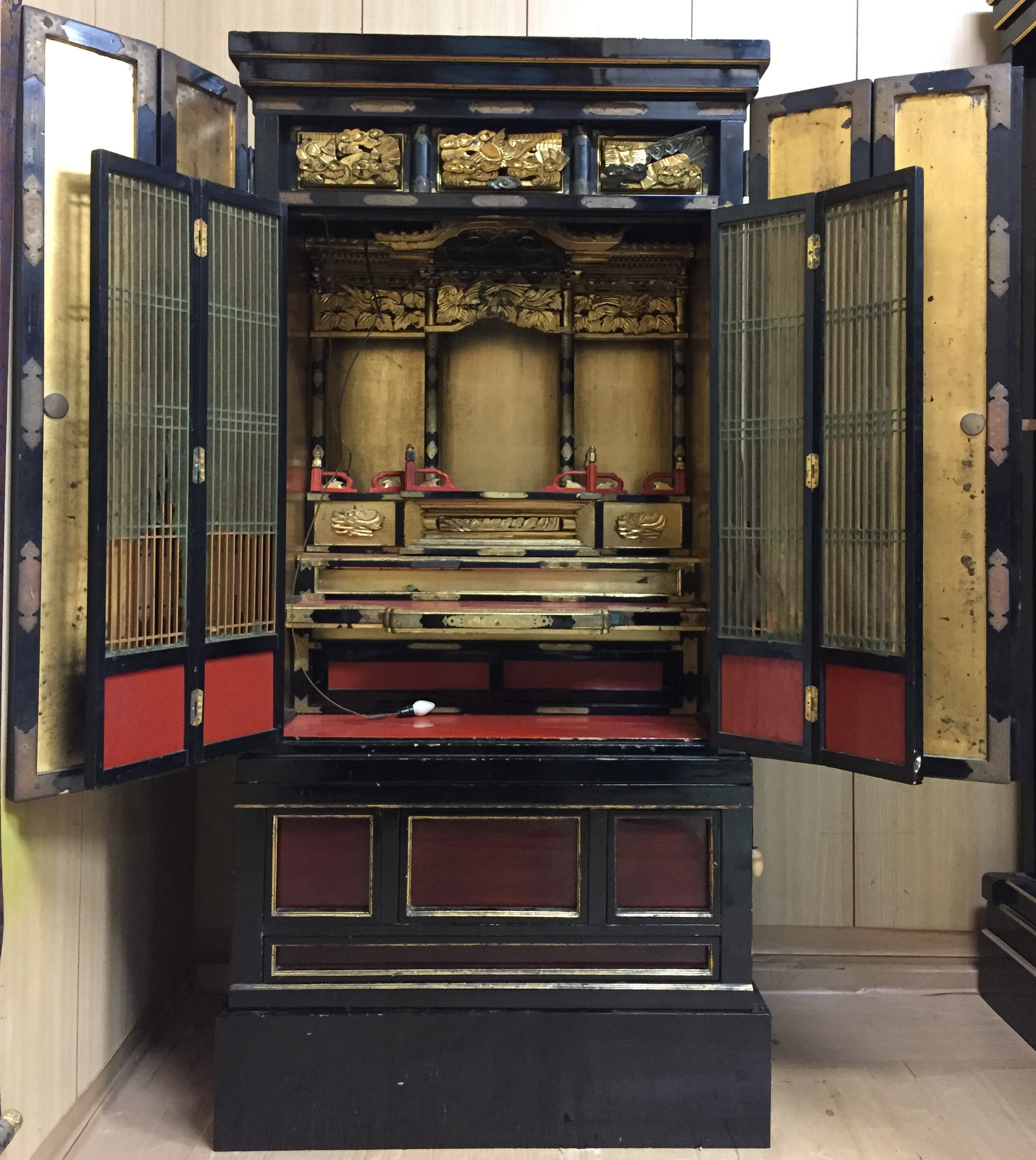 長年お参りされてきたお仏壇で障子が弱って外れてしまっていた。基礎はしっかりしているいいお仏壇なので弱っている箇所を新調しながら全体的に洗浄、下地、塗り、金箔、金具色付けを施して、本来のお仏壇の輝きを取り戻しました。