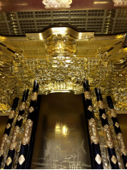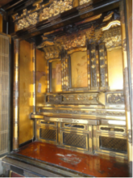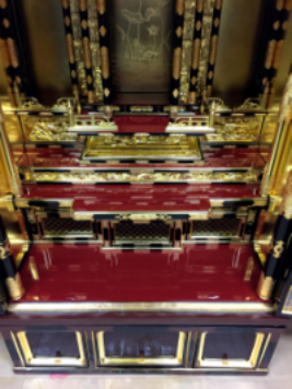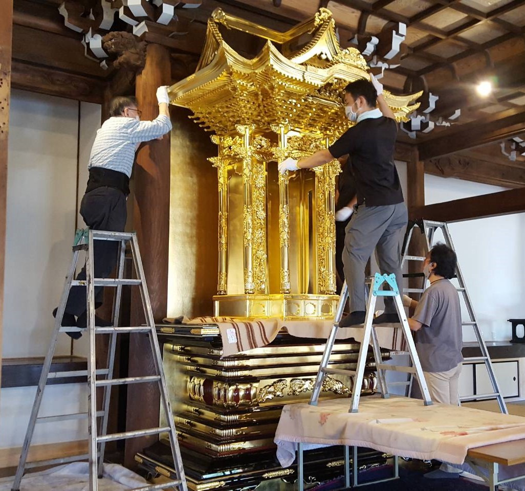 浄土真宗の寺院様へ洗浄・塗り替え・金箔・金具メッキを施し輝きを取り戻した宮殿と須弥壇を6人がかりで慎重に設置しました。浄土真宗のご本尊である阿弥陀如来像が安置される厨子になります。この様な後世に繋がるお仕事をさせていただき嬉しく思います。