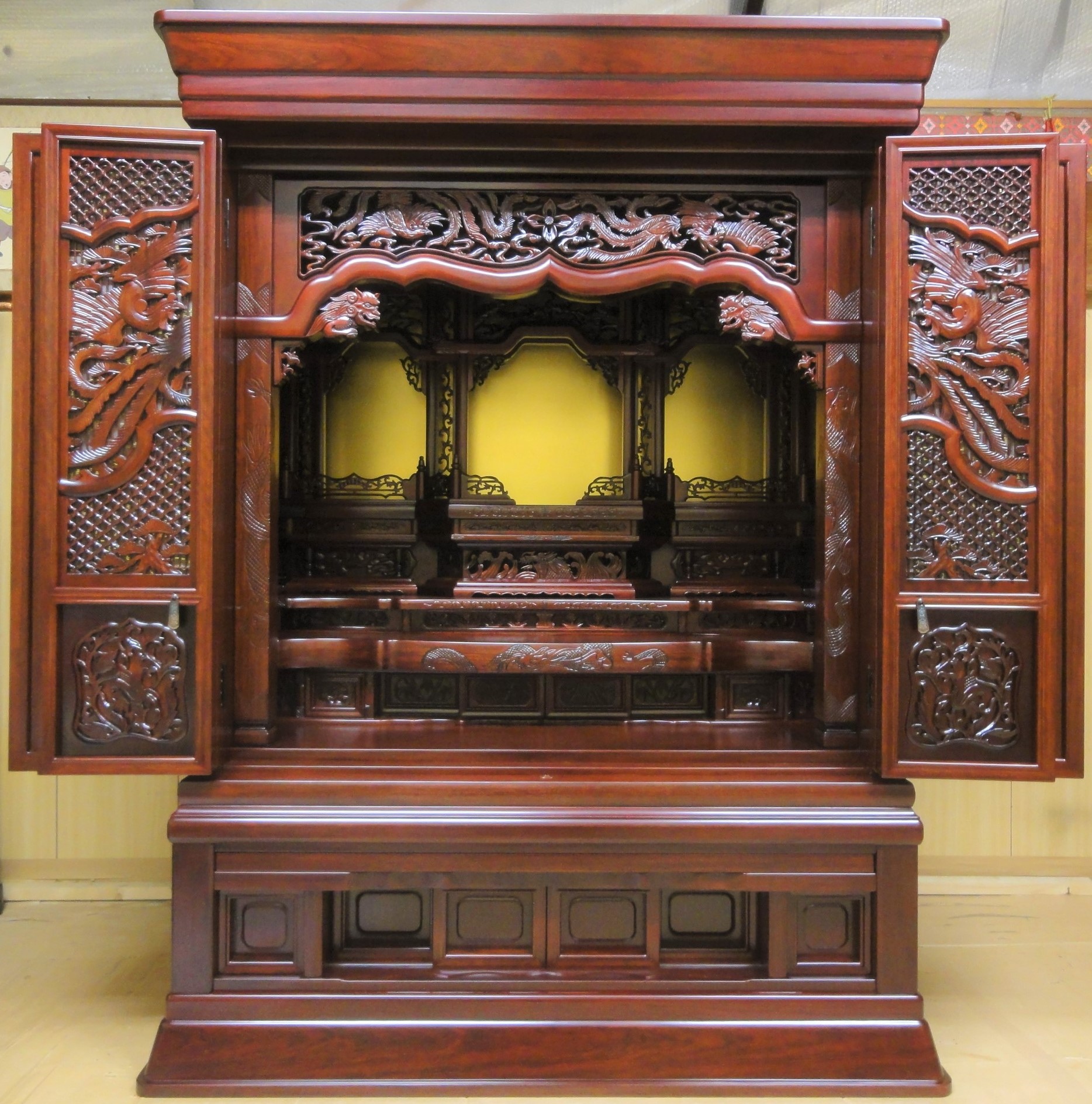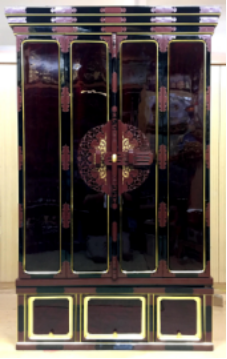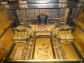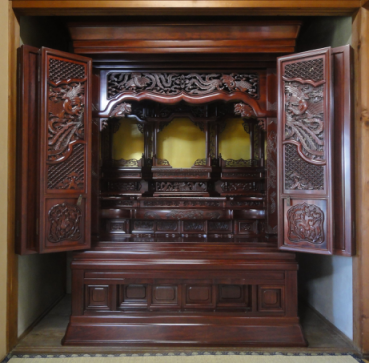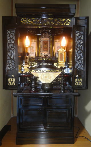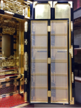 長年のお参りによる燻りで煤けたお仏壇を、特殊液により入念に洗浄しました。障子の紗の張替え、金紙の張替え、全体塗り替えツヤ仕上げによってピカピカのお仏壇になりました。唐木のお仏壇もクリーニングによってきれいに生まれ変わります。
