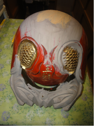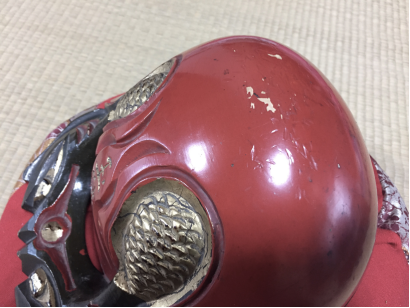 木魚がバイで叩く箇所が傷付いてへこんでいたので、下地で平らにしてペーパーをかけて塗替えをして仕上げに金箔を施しました。