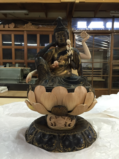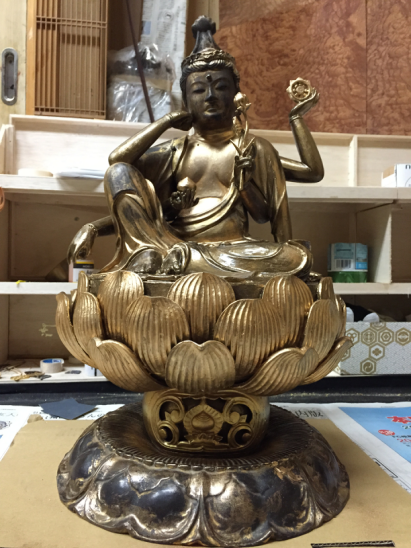 @【仏像修復】如意輪観音像 A不足部位の手・持ち物・蓮・彫物を製作 B塗り・金箔・金粉を施して完成