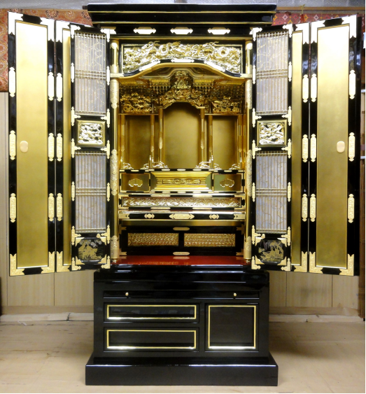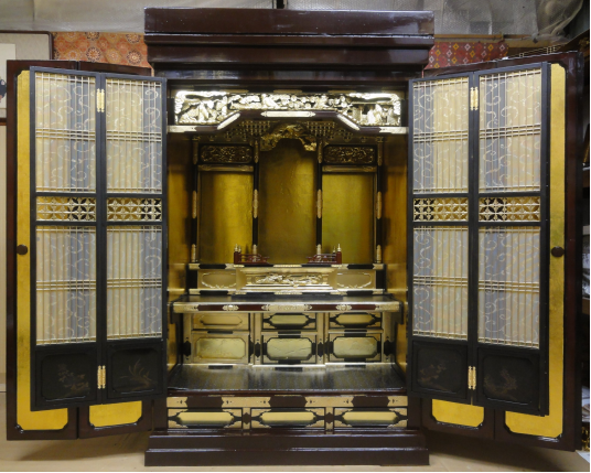 長年よくお参りされていてお線香による燻り具合がお家の歴史を物語っているようです。施主様よりお西からお東に仕様変更しました。柱の金が黒塗りになり金メッキをし直した金具が引き立ちました。高級仕上げにて、全体塗り替え・金箔押替えを施して次の代へ引き継がれるよう心を込めてお洗濯させていただきました。