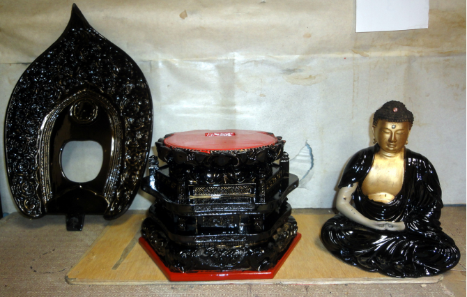 @木魚 塗り・金箔直し前 A下地 B塗り C金箔押し替えして完成
