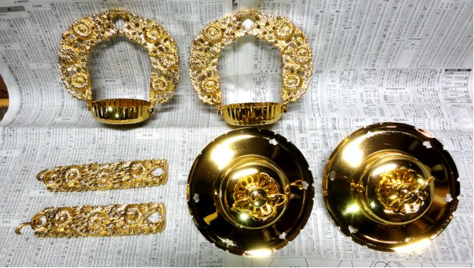 りん灯を洗浄して金メッキを施ししました。これで大変な作業のお磨きが不要になります。真鍮製品でしたらなんにでも金メッキや色付けができます。