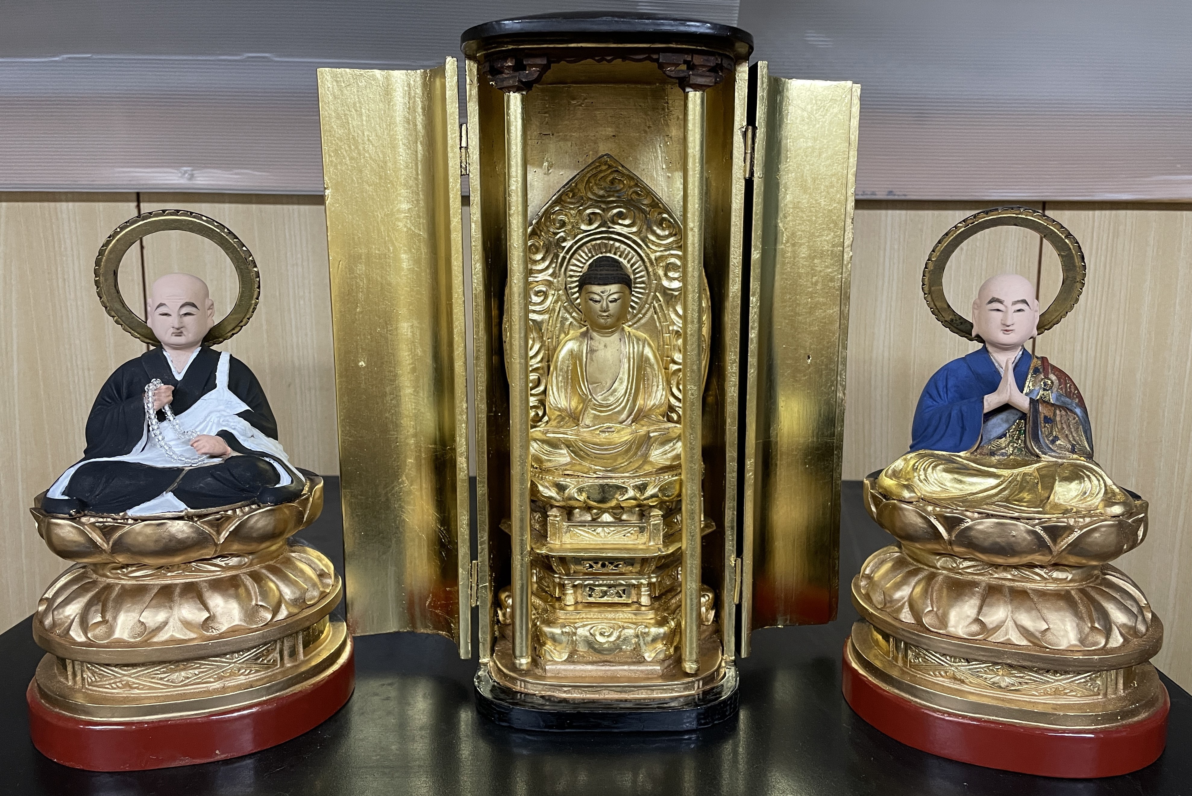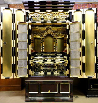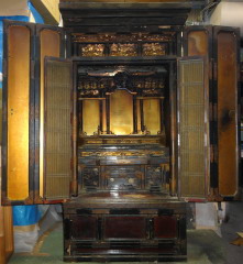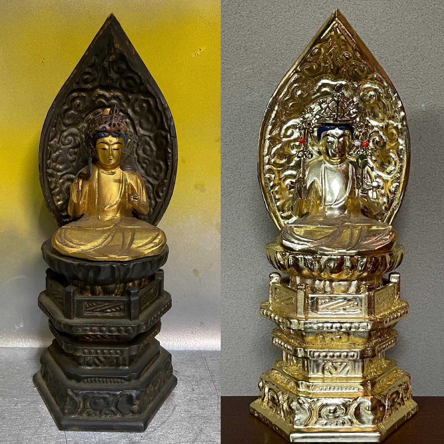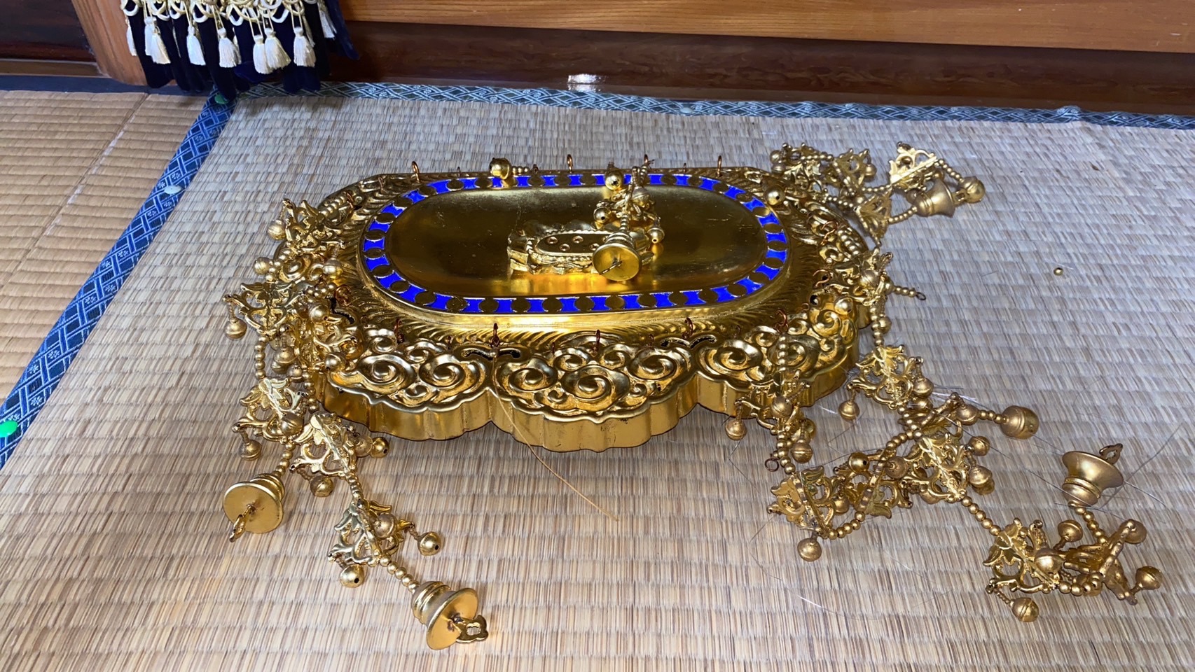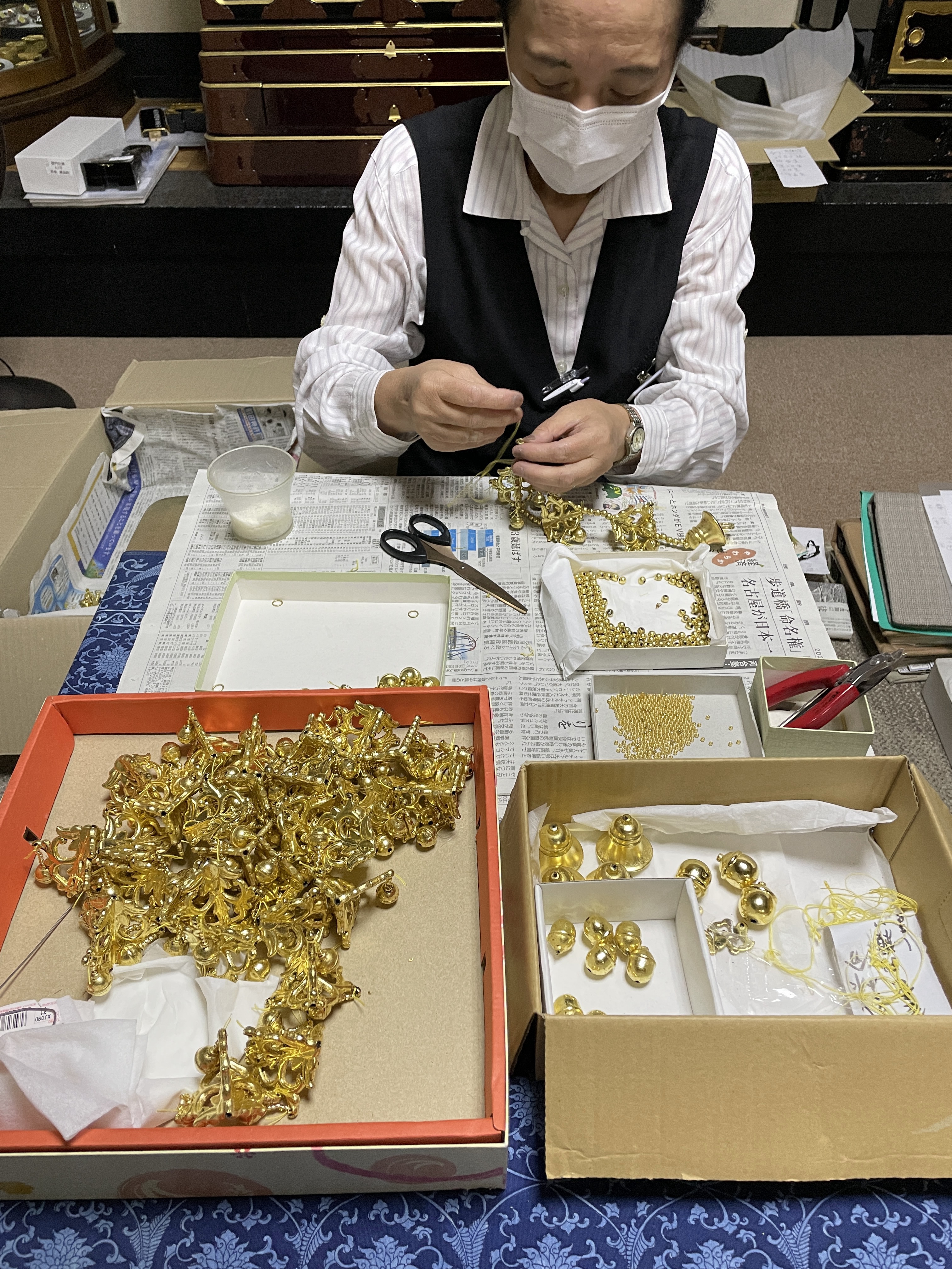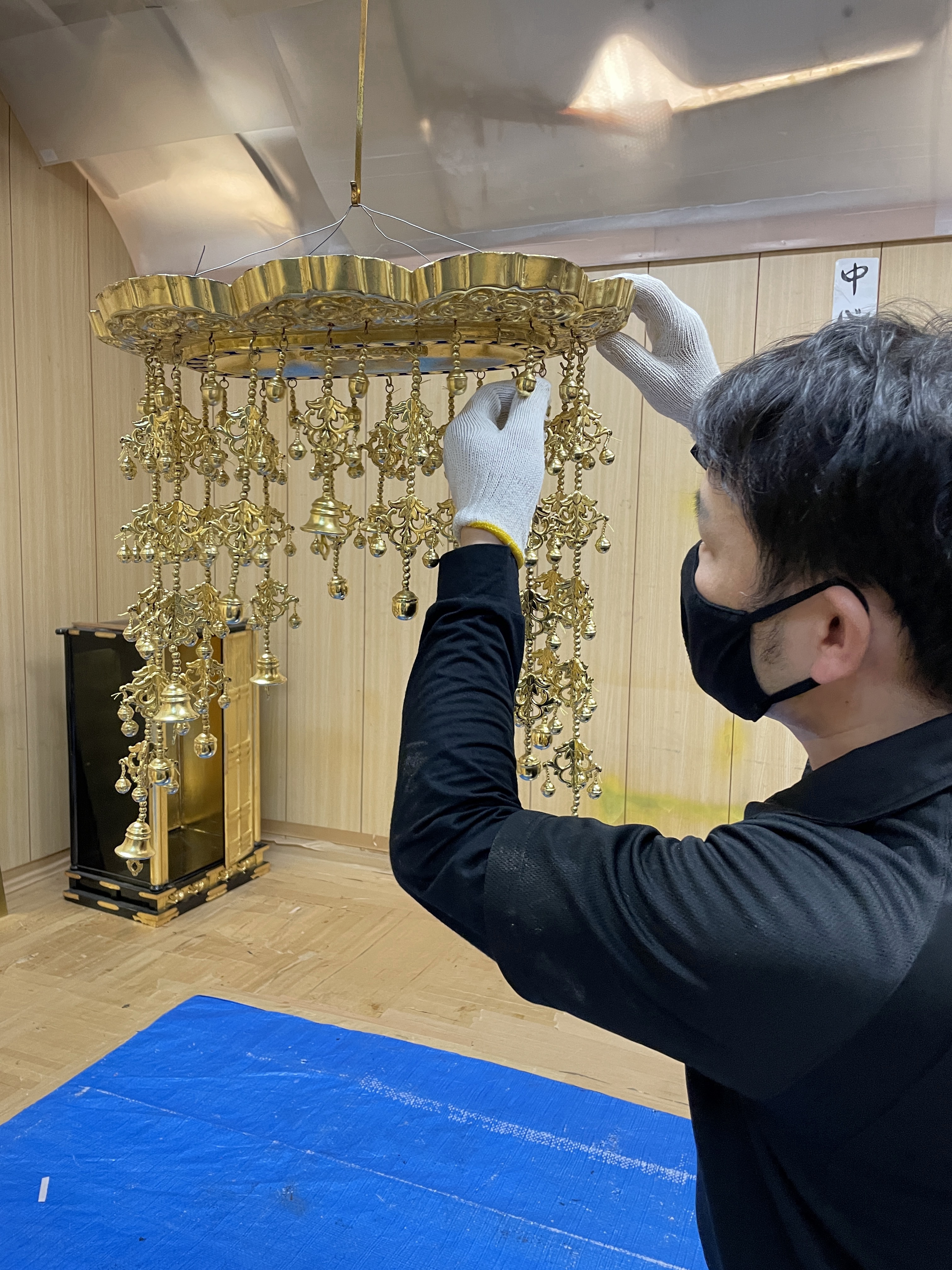 お仏壇の天蓋(てんがい)が突然落ちて来て瓔珞(ようらく)も千切れてばらばらになったというお客様。見せて頂くと天蓋を吊っていた紐がビニール製で千切れてしまっていて(普通は針金など金属の物を使用する)、千切れた瓔珞は経年劣化により糸が弱っていたのと燻りによる汚れを確認したので、洗浄と糸のつなぎ替えをする事になりました。瓔珞のつなぎ替えは非常に手間のかかる作業で、物によってつなぎ方も違うので熟練の技術になります。洗浄→ばらばらになった部品を選別→不足分を補充→穴の掃除→手作業でつないでいく、という工程を経て完成です(約3週間の工程)。後日お客様のお仏壇に設置する際には丈夫な針金でしっかりと吊って設置いたしました。お客様にも喜んで頂けた様で、どうもありがとうございました。